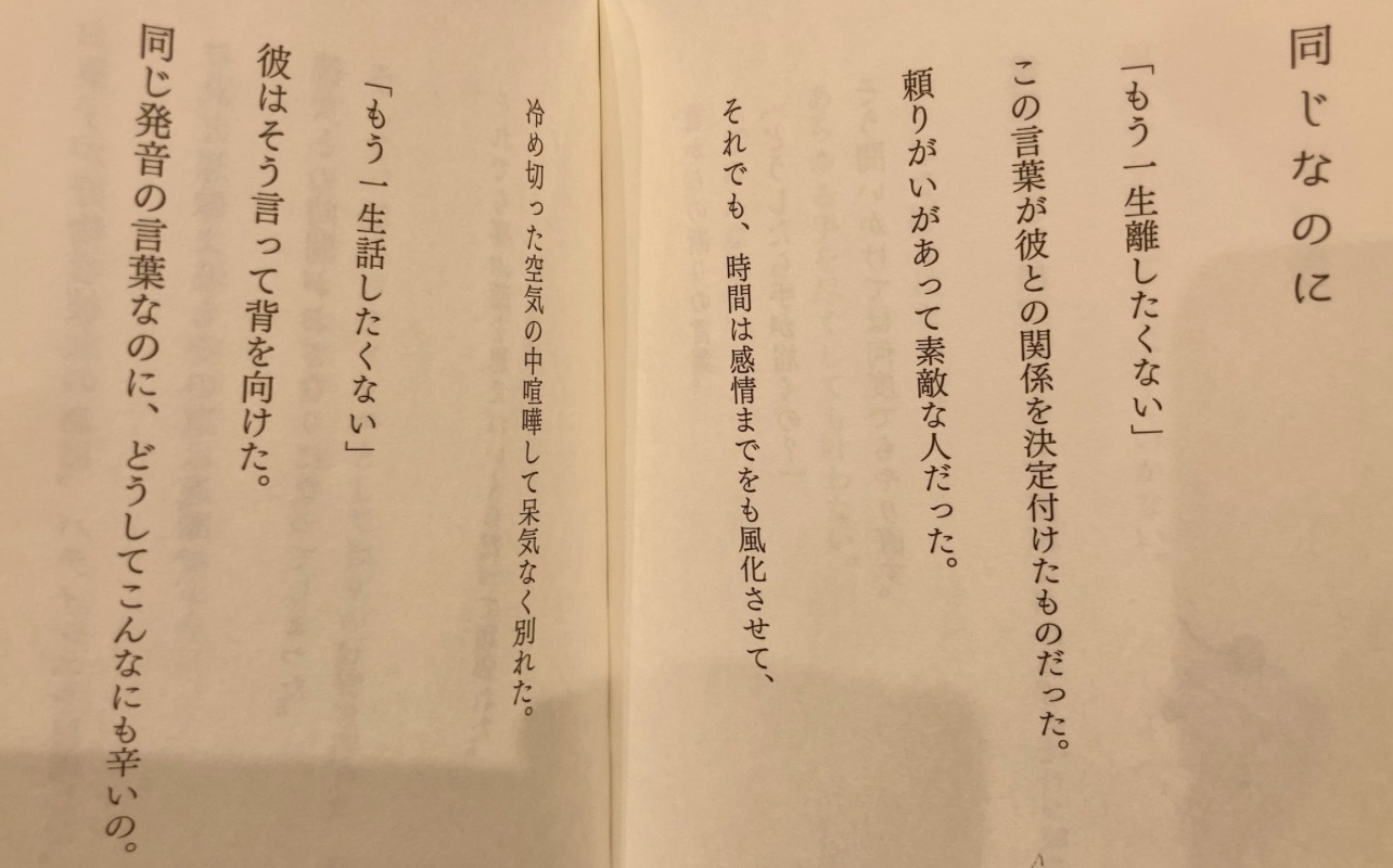「離したくない」と「話したくない」で同じ「はなしたくない」なのに、こんなにも意味が違うのかって詩です。